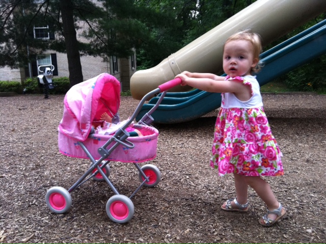 Your 8 month old baby probably weighs more than her. I couldn't believe how light she was. I thought the scale was broken. I was expecting at least 23 pounds. Heavyweight or not, she is still the cutest and sweetest little girl. She is so playful now and loves to be chased and to chase others. She also plays her own version of tag. Her friend Grant was over on Wednesday and she grabbed him around the waist, said something in Toddler-ese and ran away. He must have understood her because he ran after her. They had a great time taking turns being "it." Macy is so grown up now she is ready for work! She wanted to be hands-free so she can drive while working.